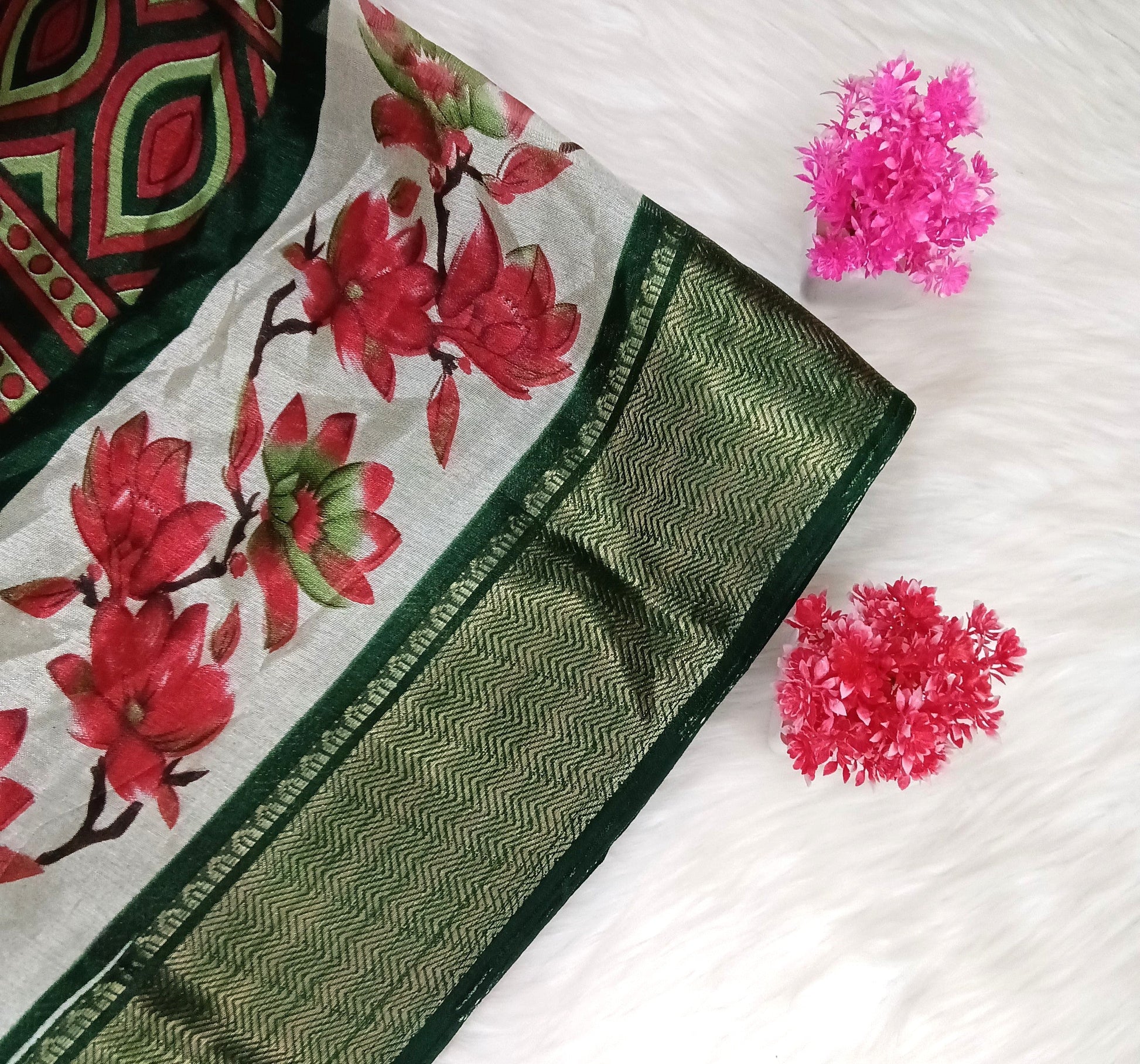 It features a vibrant, multi-color floral print across the body. The saree is accentuated by a contrasting dark Color border with intricate zari woven patterns. The fabric is known for its elegant appearance, offering a sophisticated look.