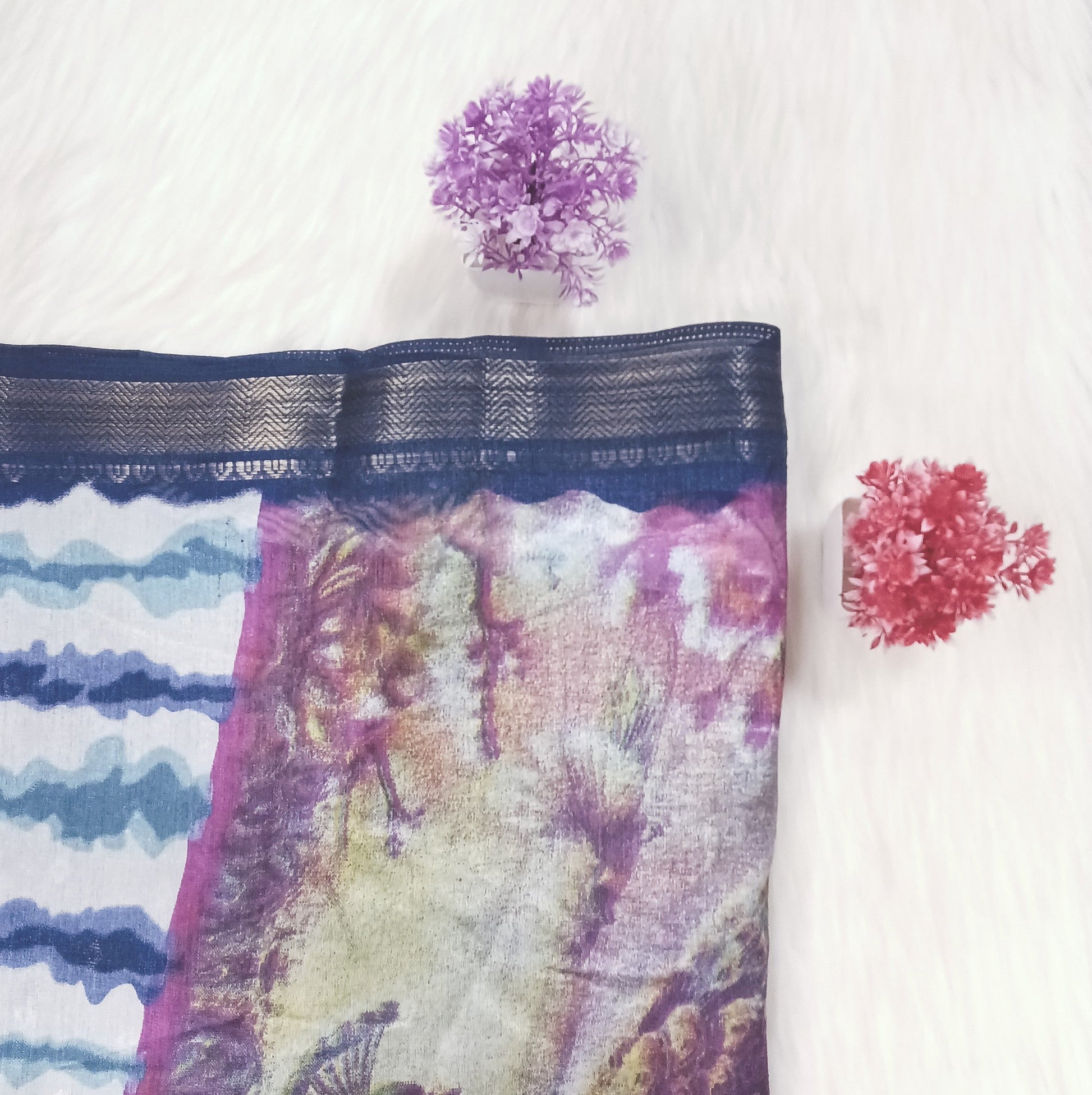 It features a vibrant, multi-color floral print across the body. The saree is accentuated by a contrasting dark Color border with intricate zari woven patterns. The fabric is known for its elegant appearance, offering a sophisticated look.