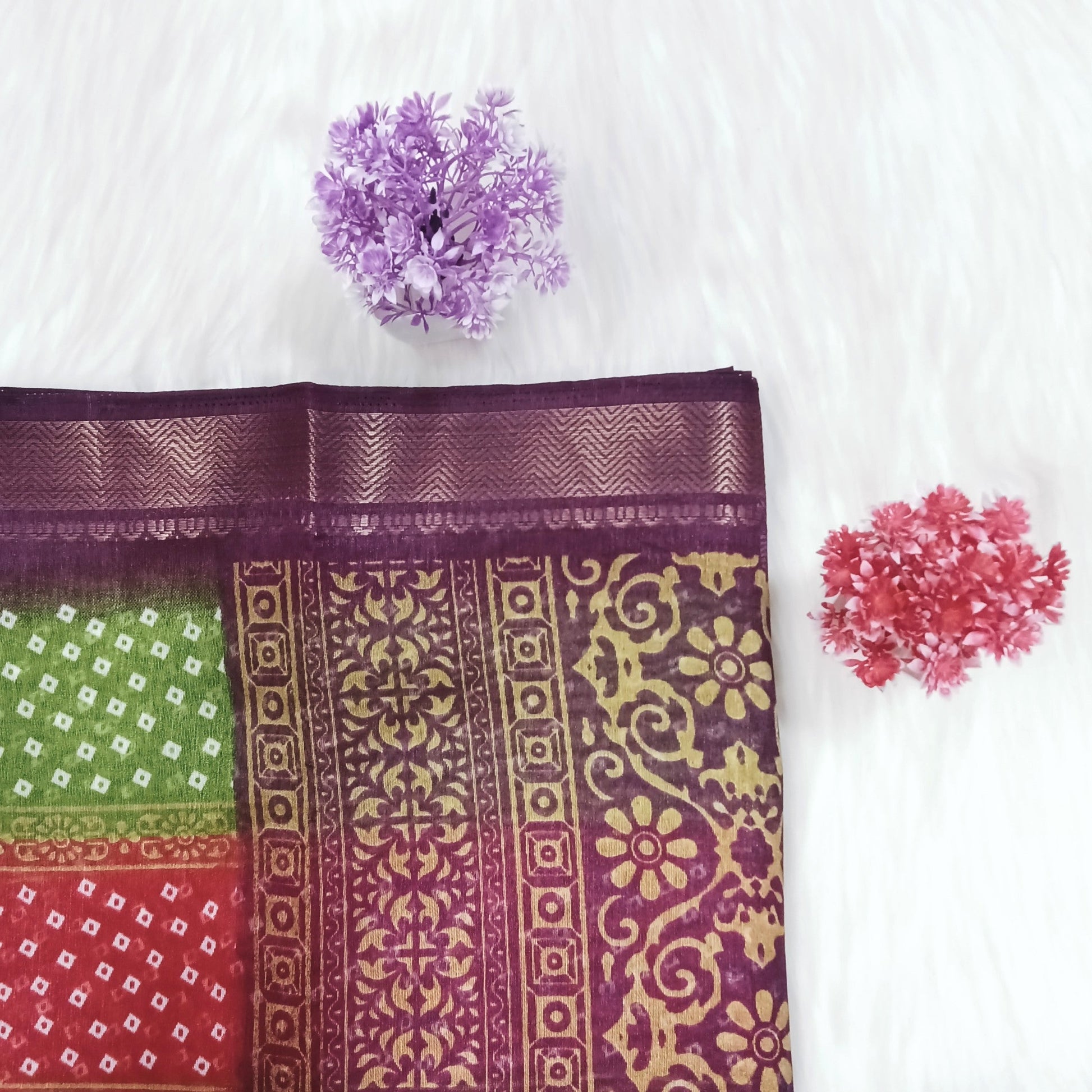 It features a vibrant, multi-color floral print across the body. The saree is accentuated by a contrasting dark Color border with intricate zari woven patterns. The fabric is known for its elegant appearance, offering a sophisticated look.